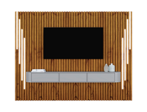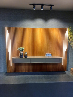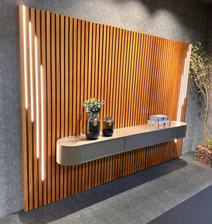 The Flippo home is made of MDF, has a panel finished in natural wood veneer with slatted details and LED lighting. Lacquer drawer with a domed shape has 3 drawers with three-stage telescopic slides.