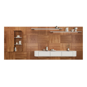 The Home Amore Mio is made of MDF, its countertop has a lacquer finish top with self-polishing and drawers with three-stage telescopic slides. Panel with natural wood veneer mosaic, lacquered shelf with LED lighting, bin with partitions and organic shape.
