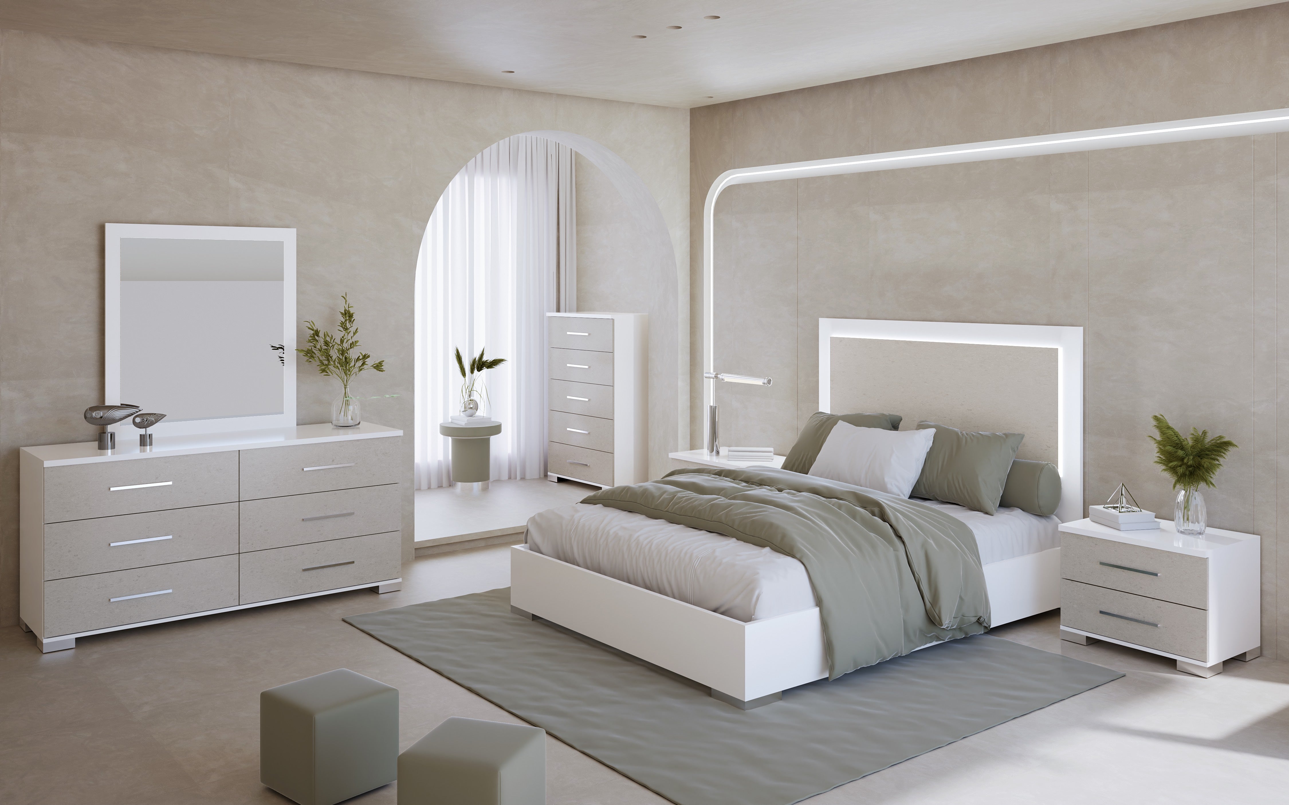 Boston Bedroom Set Queen Bed w/Storage + Dresser + Mirror + Nightstand w/LED White