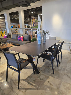 Finish: Black Sintered Stone Top / Black Aluminum / Black Textilene / Light Brown Polywood