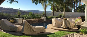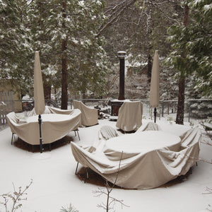 Made with RhinoWeave wich is a Canvas fabric that is made of 100% polyester, it is 600 denier, water resistant, durable, versatile and reliable. It's a very tough fabric, designed to be both durable and breathable. The fabric is also water resistant and will not crack or peel like vinyl covers do. The best thing about Rhinoweave is the softness of the fabric. It won't scratch the furniture underneath, keeping it protected all year long