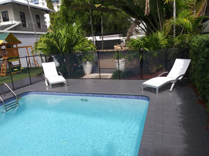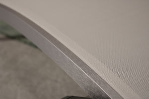 Finish: Brushed Aluminum Frame / Dark Grey Polywood (Synthetic) Arms / White Textylene Mesh